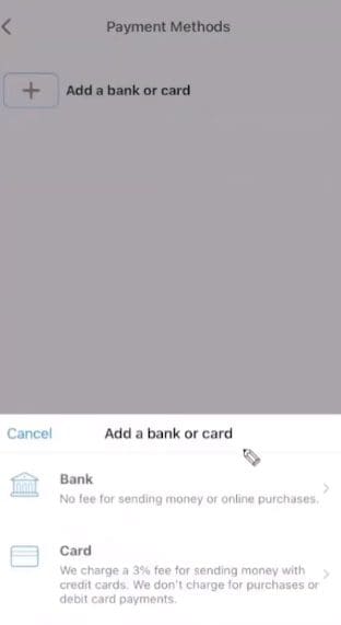 - Select “Add a bank” or “Card.”