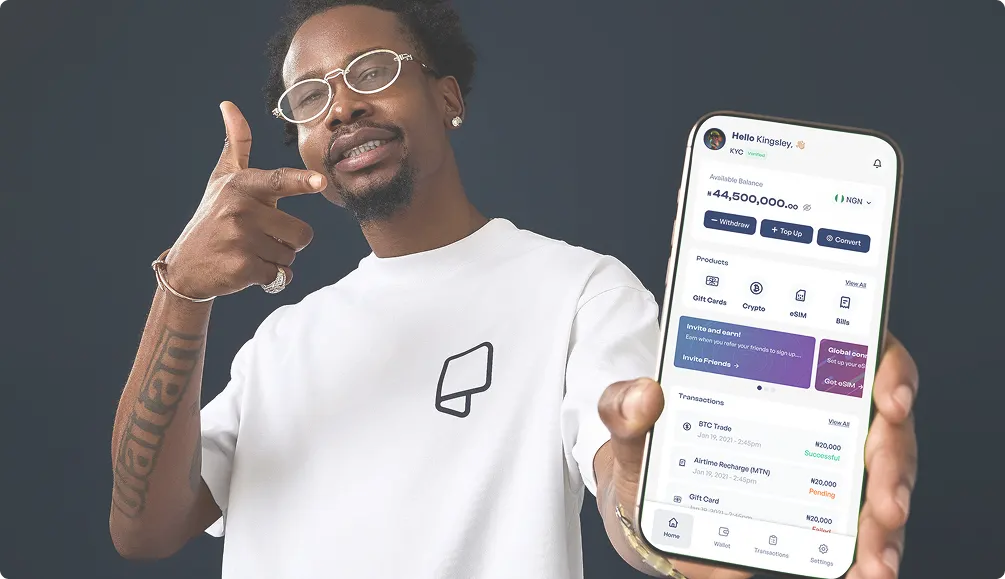One platform. Everything you need — crypto, gift cards, eSIM, airtime, and bills. The best part is, you can pay or be paid in Naira, Cedis, or Crypto.